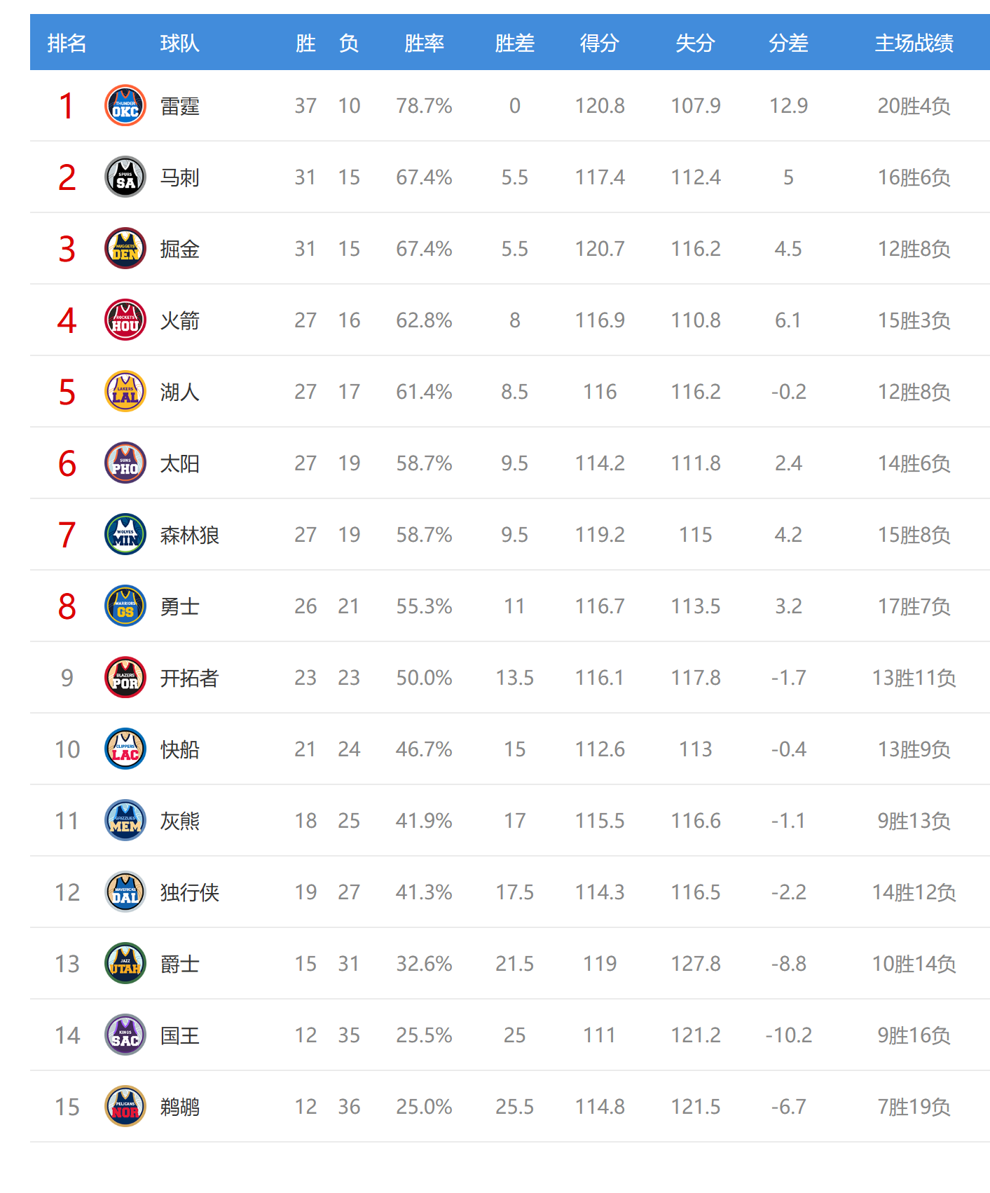 今日比赛后西部排名没有变化,但各队间的差距有所改变。