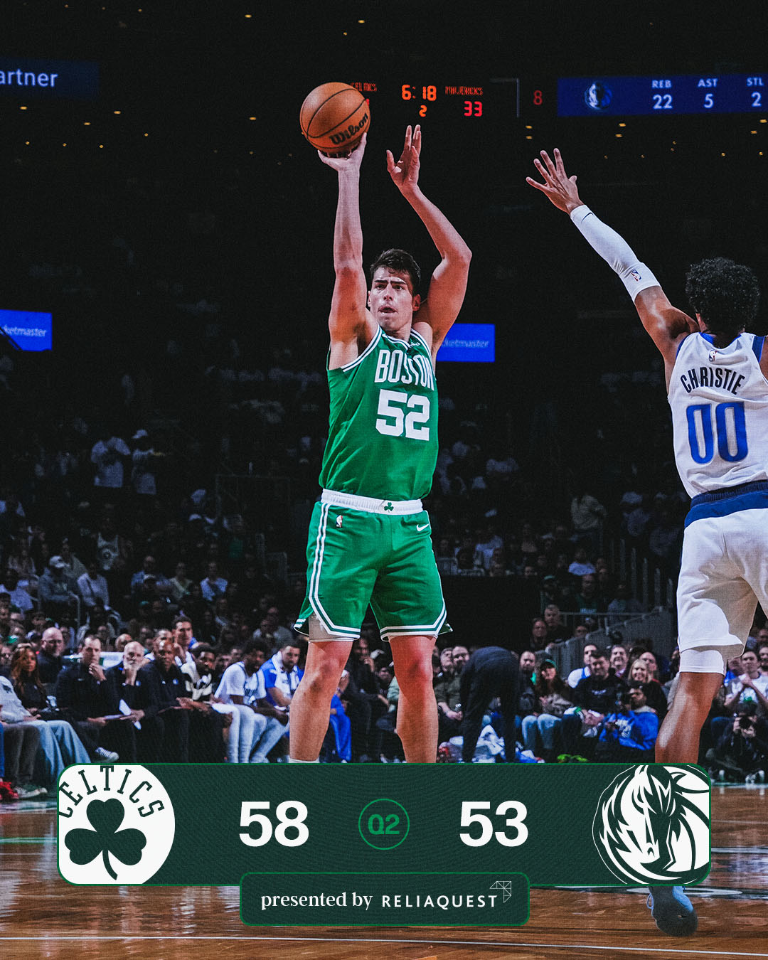 凯尔特人队的怀特上半场得到13分,布朗得到10分、4个篮板和4次助攻,加扎得到10分,塔图姆8投2中,得到5分、5个篮板和5次助攻;独行侠队的马绍尔得到13分,弗拉格得到10分和4个篮板。